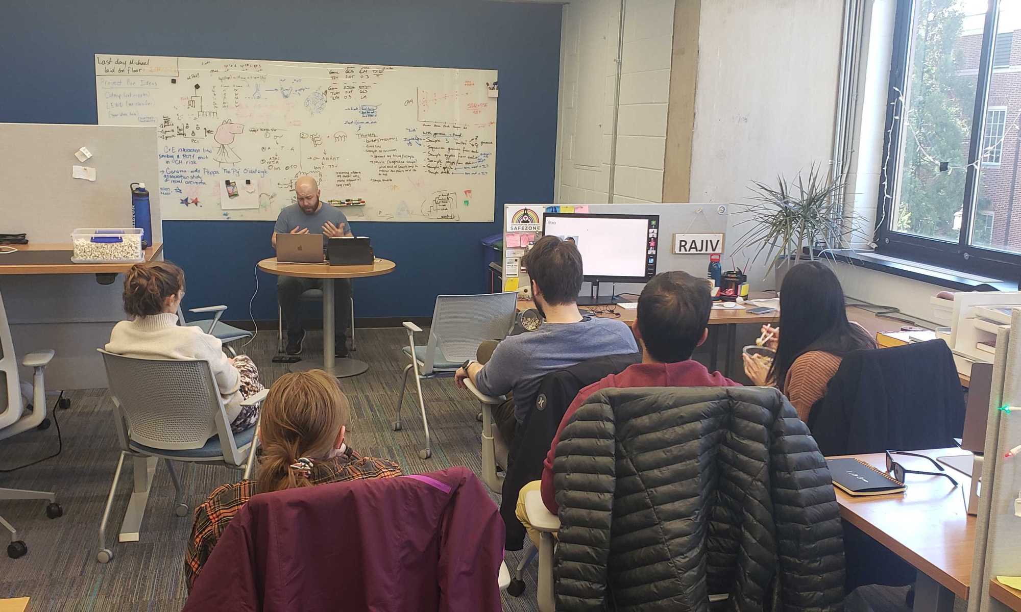 Posted on March 8, 2023December 23, 2024 by rajivmccoyNew lab tradition The lab spectates Andrew’s Joint Lab Meeting presentation from the lab space, starting a new tradition. Related