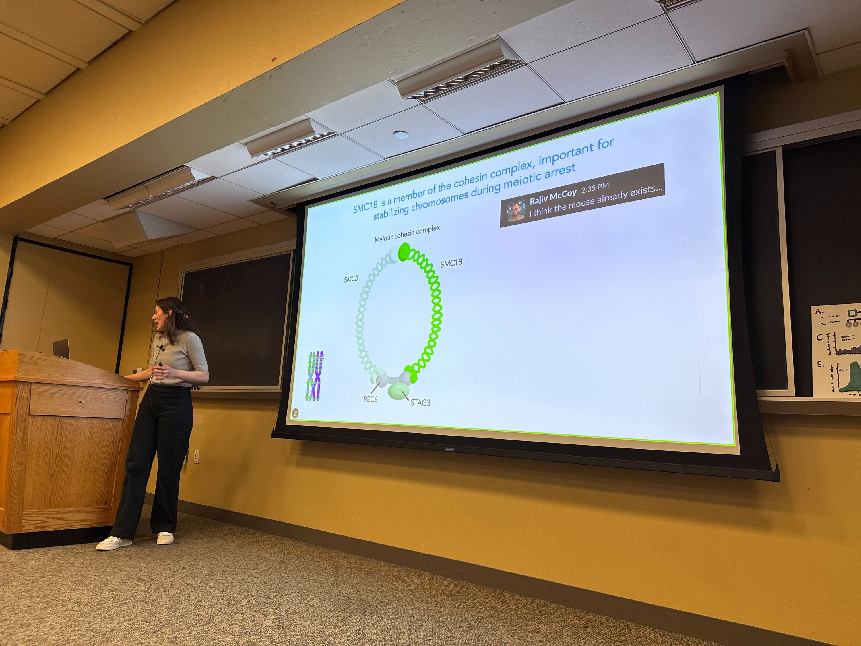 Sara Carioscia gave her public thesis defense talk describing her research investigating mechanisms and genetic influences on the accuracy of chromosome segregation during the formation of human eggs and sperm. Her research helped uncover how common genetic variation in maternal genome influences risk of chromosome abnormalities that underlie pregnancy loss. Congrats to Dr. Carioscia!