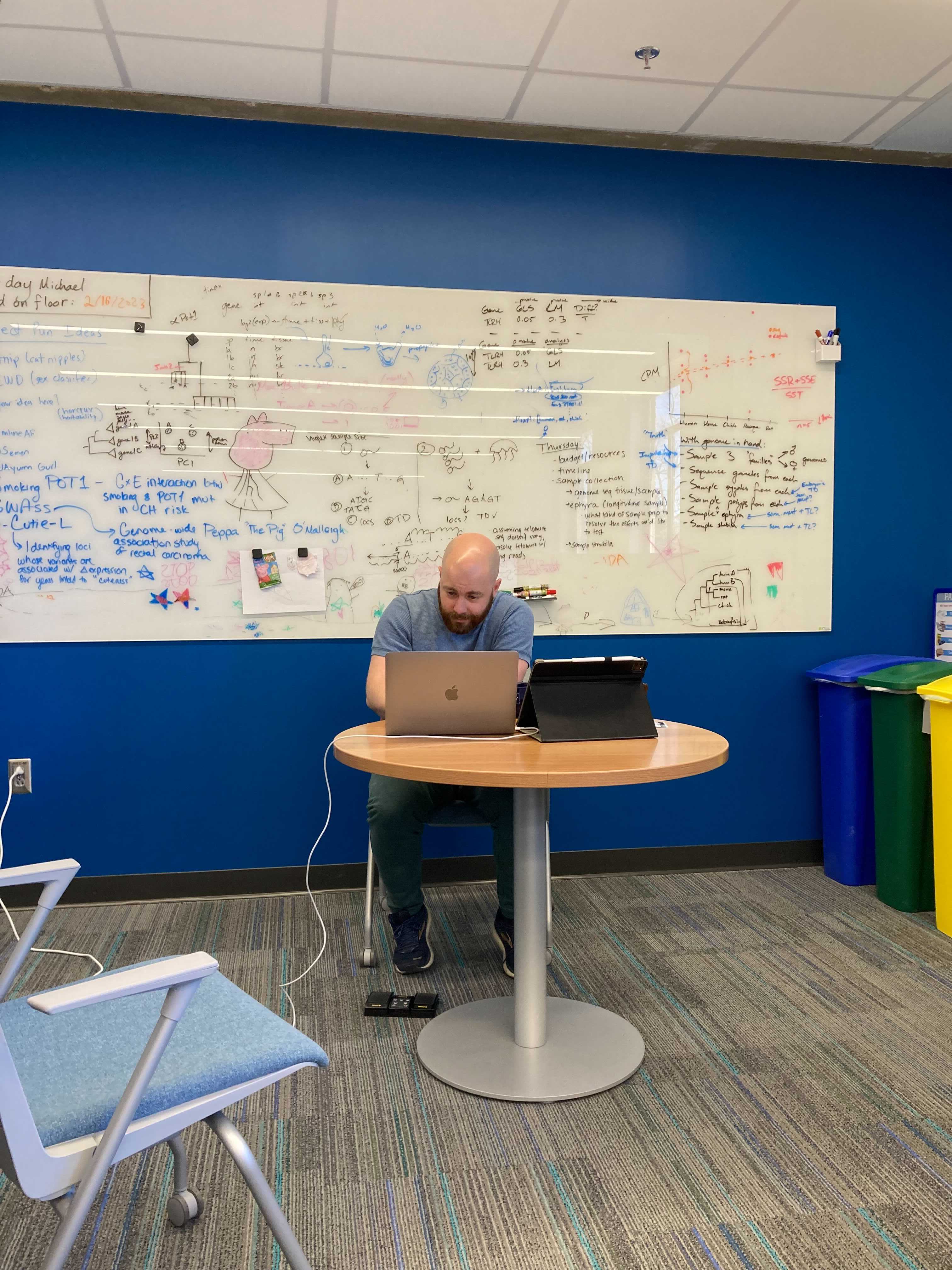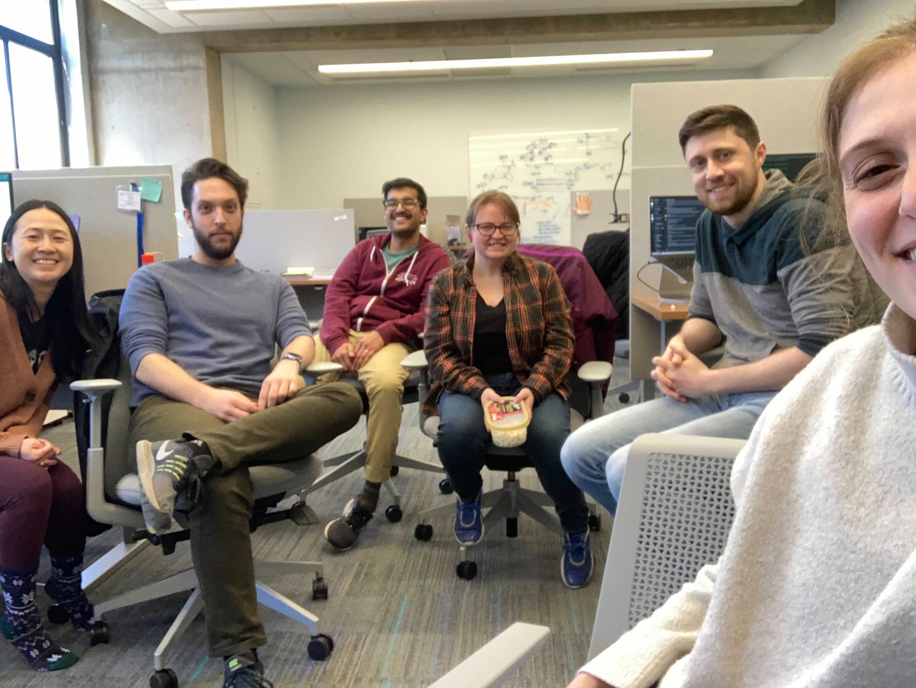The lab spectates Andrew’s Joint Lab Meeting presentation from the lab space, starting a new tradition.
